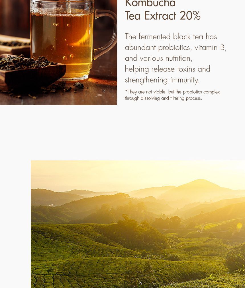 - 含有康普茶,一種發酵紅茶,含有豐富的益生菌和維生素 B,有助於釋放毒素和增強免疫力。