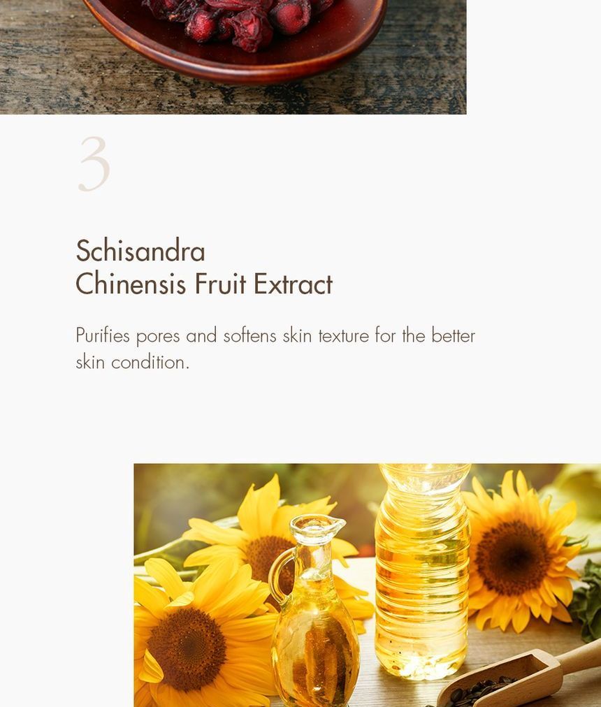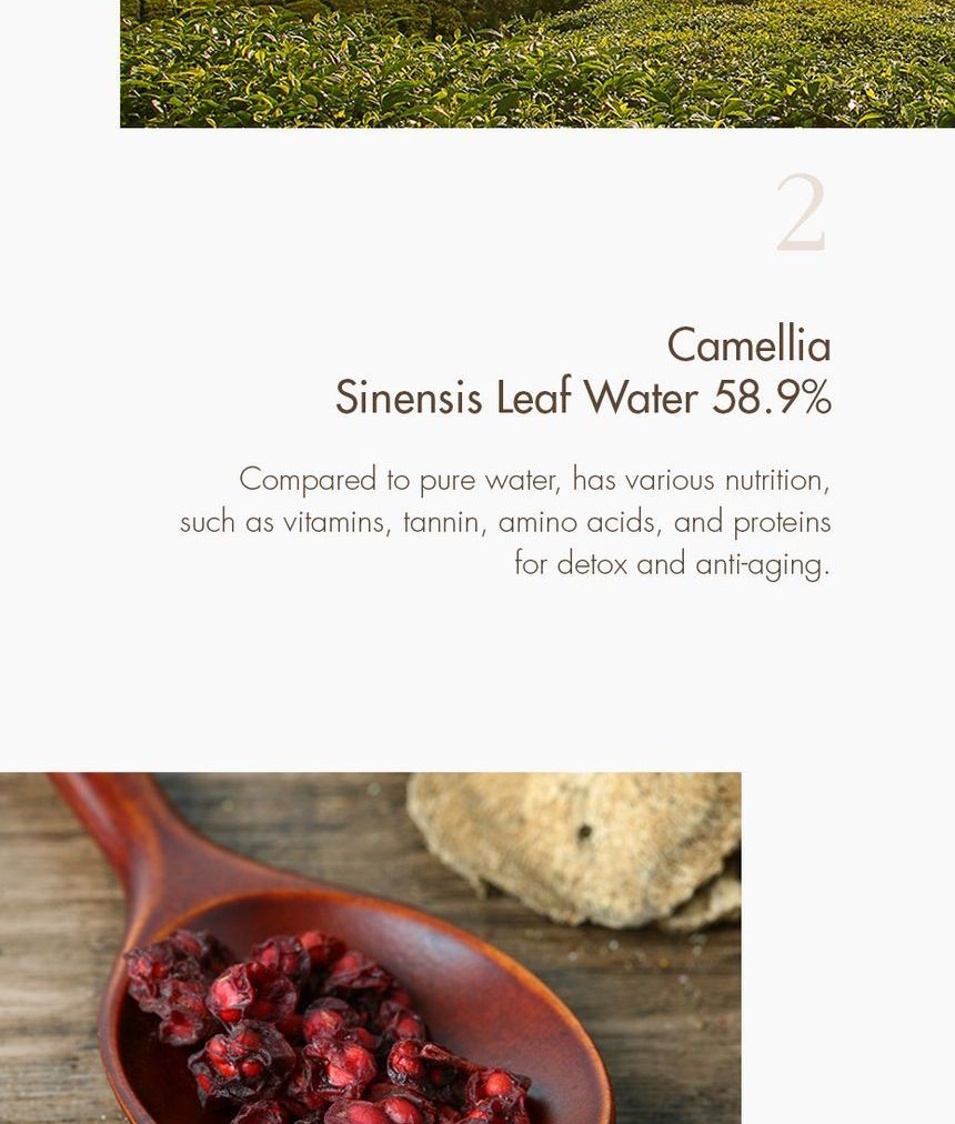- 含有純素茶複合物,包括茶花葉水、茶花葉萃取、酵母菌發酵濾液和五味子果萃取物。
