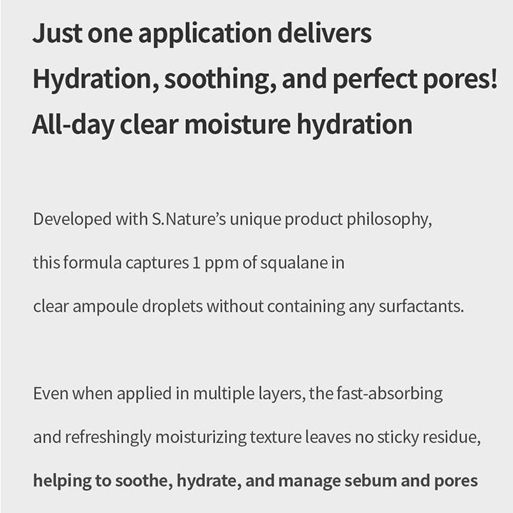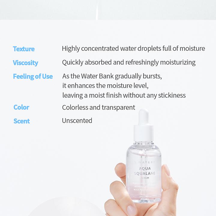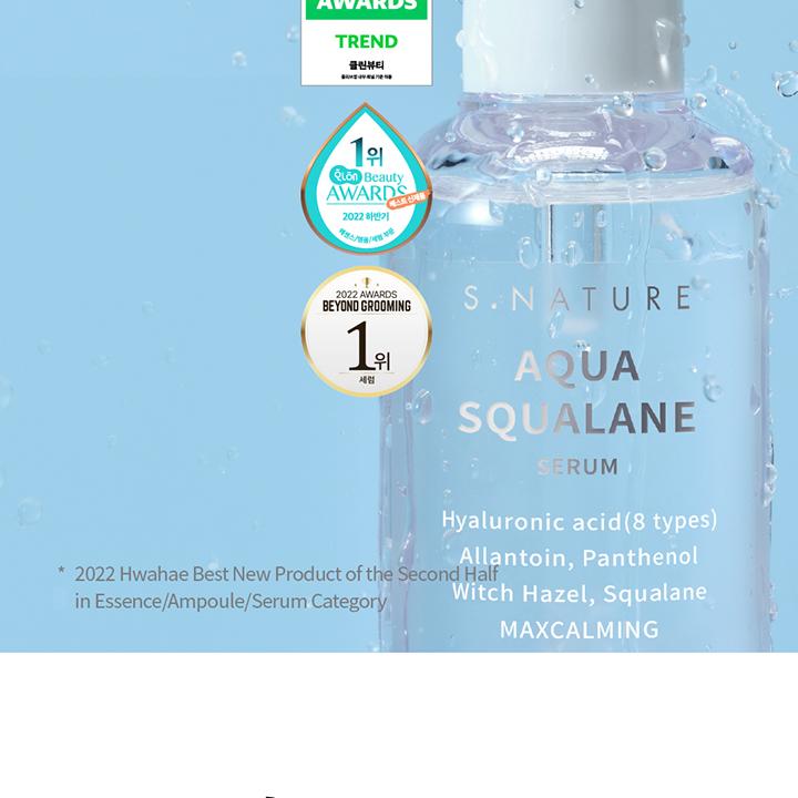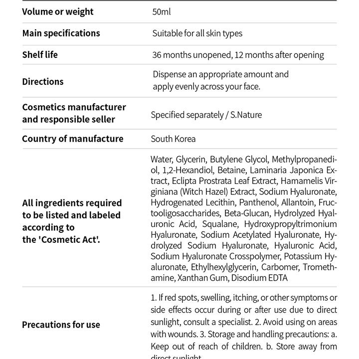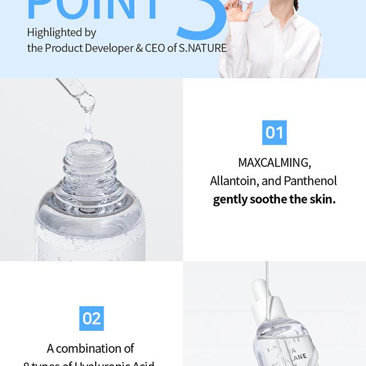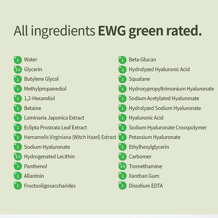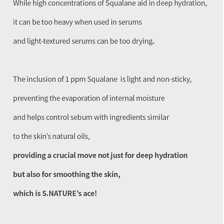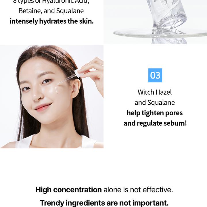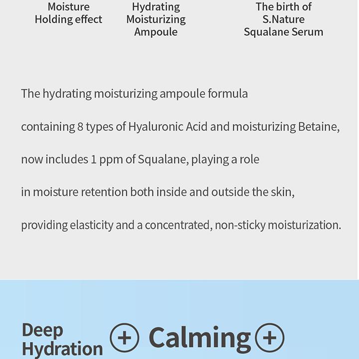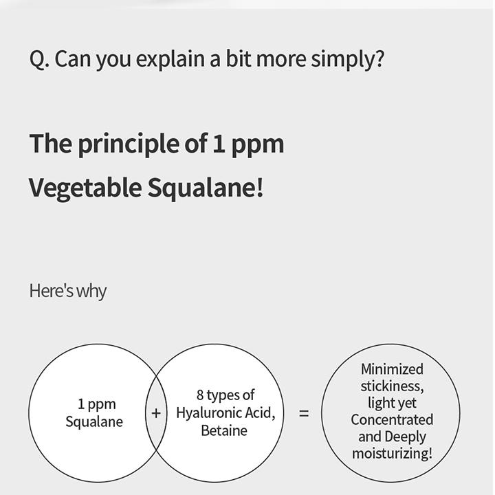 - 含有 1ppm 角鯊烷和 8 種透明質酸,可為皮膚補充水分,並透過甜菜鹼防止脫水