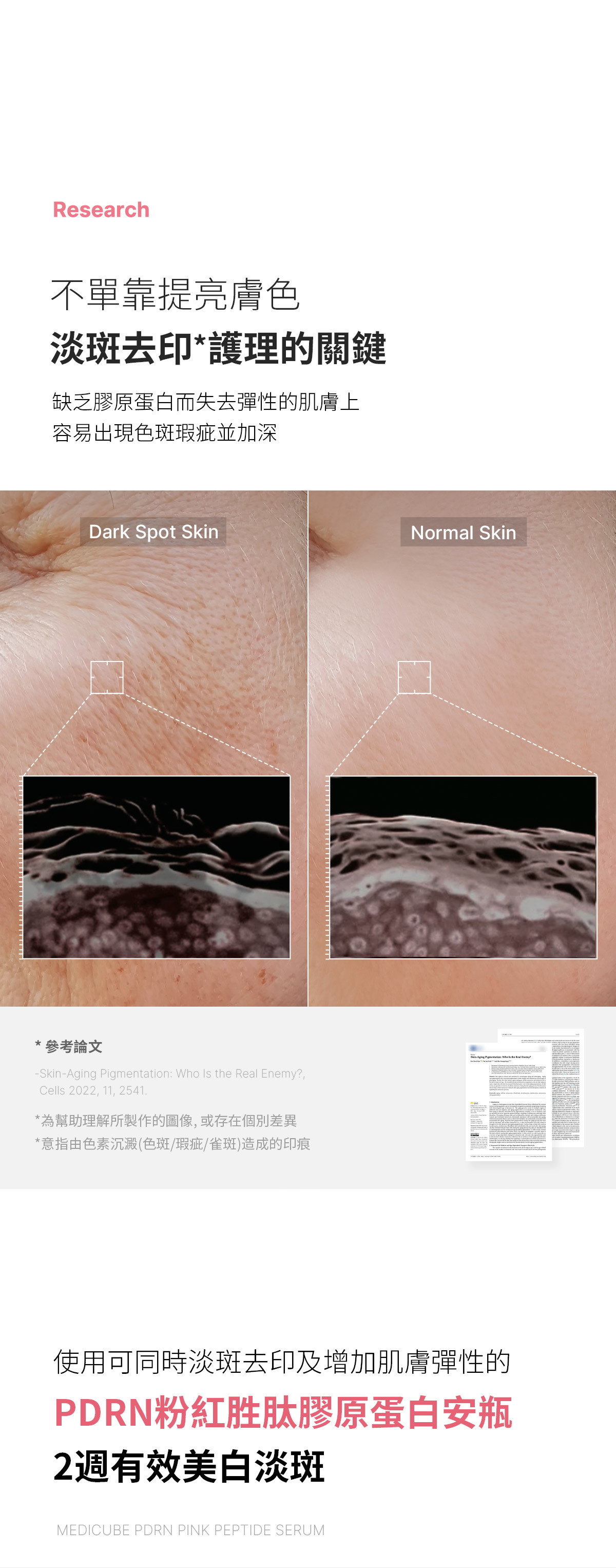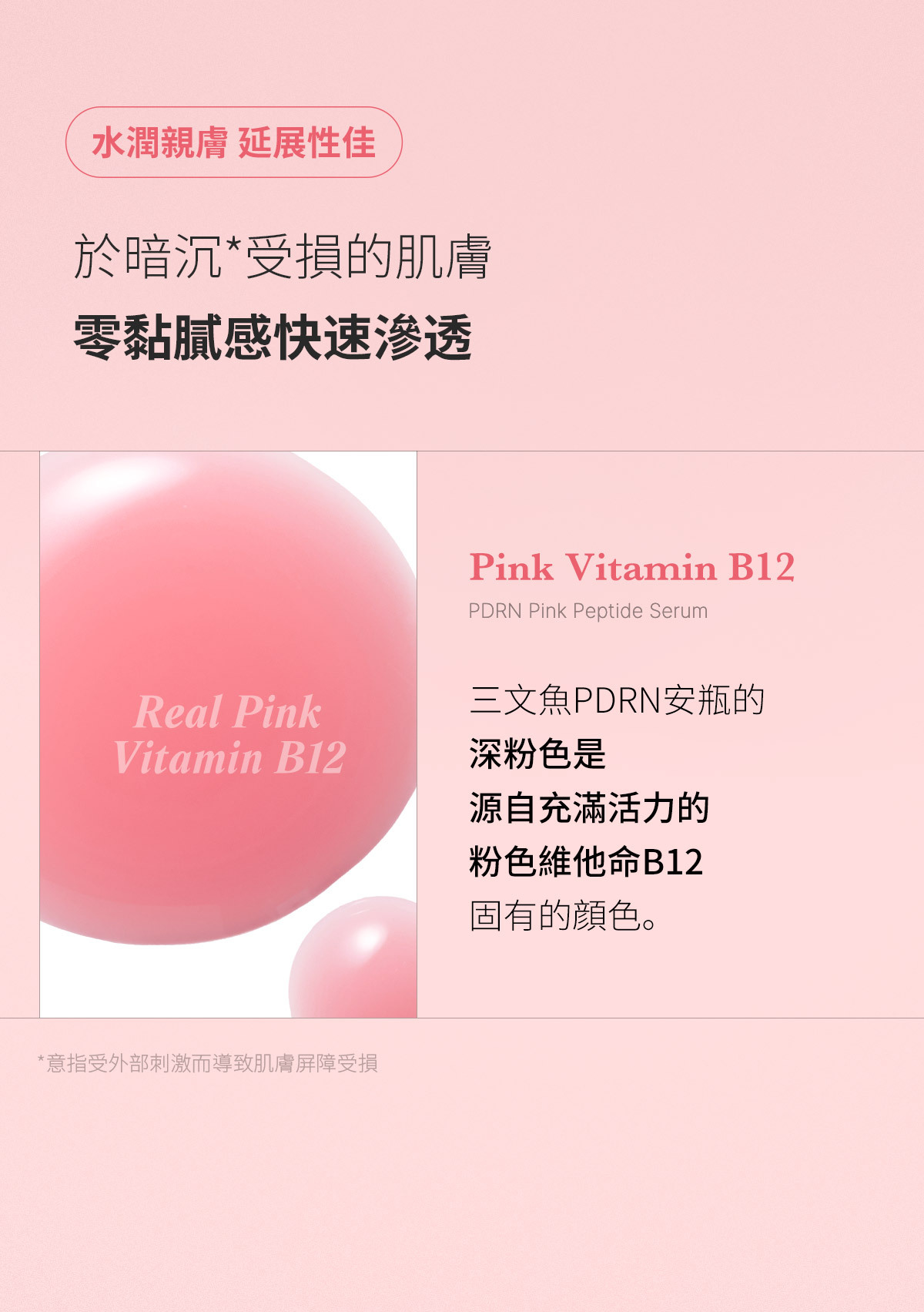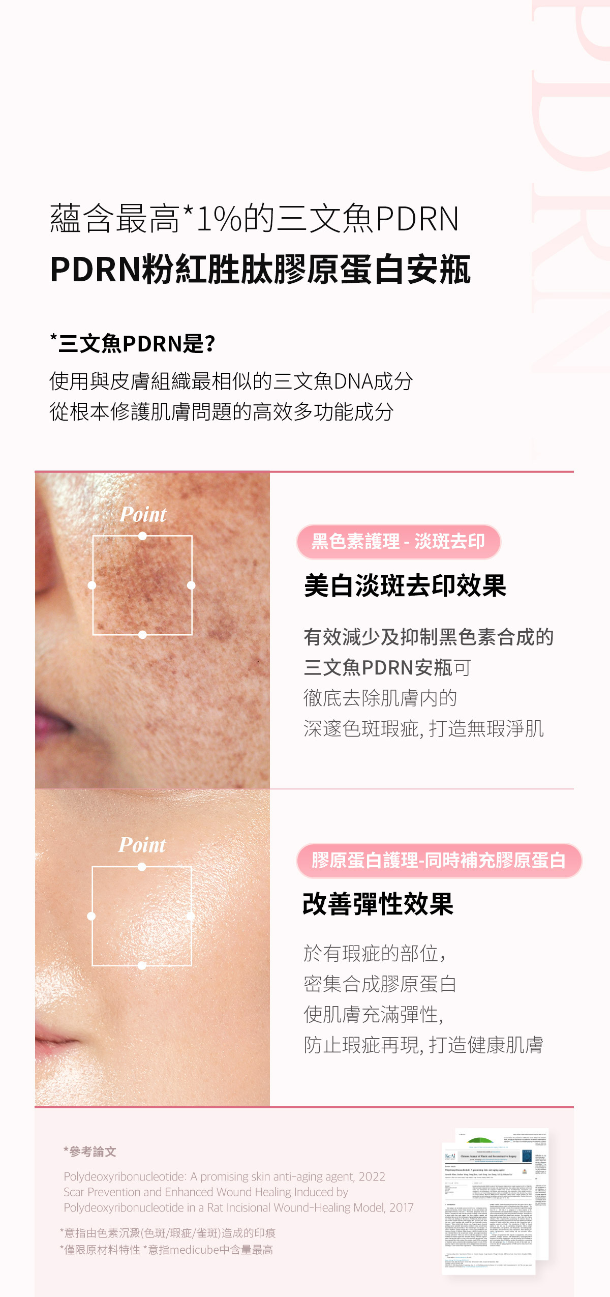 主要成分:含有鮭魚 PDRN、五種勝肽複合物、菸鹼醯胺、腺苷和聖羅勒葉萃取物,該配方可有效護理不均勻的膚色和彈性。